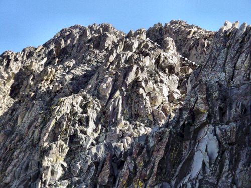 we reached the point where we had to choose our route, we had a clear view of both the South Slope, leading to Scree (Lavender) Col, along the class 2+ route, and the Southwest Ridge, along the class 3 route. The South Slope looked steep and unpleasant, with slippery dirt alleys down the center and lots of scree along the sides. We could see other climbers, looking like mere specks, climbing through the scree on the South Slope. It did not look like a lot of fun, nor did it look easy. The Southwest Ridge was also visible, rising in front of us with its jagged ridge line and sharp, snaggy pinnacles. It did not look easy, either. In fact, it looked quite intimidating and challenging, but it also looked like a lot more fun than climbing through the scree. We discussed the pros and cons of each route, but in the end, we listened to our inner voices telling us to "do it." We chose the class 3 Southwest Ridge route for our ascent, and the class 2+ route for our descent.